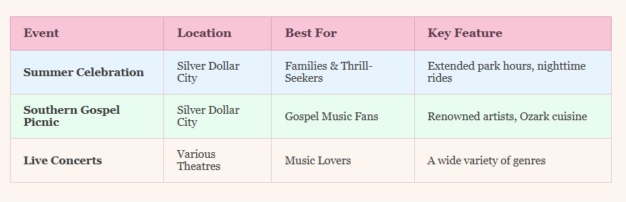 The best August events in Branson for late-summer fun include Silver Dollar City’s Summer Celebration, the Southern Gospel Picnic, and a variety of live concerts. These events offer a perfect mix of theme park thrills, soulful music, and outdoor entertainment, making August an ideal time to visit the Ozarks.