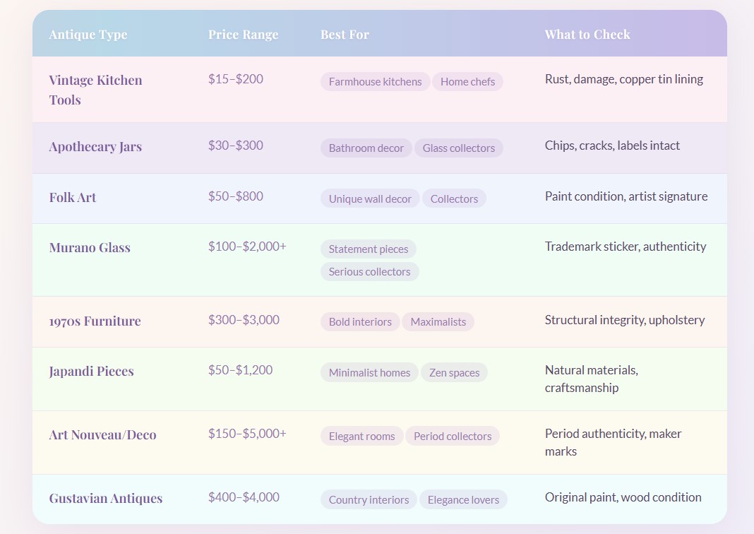 Small collectibles start around $10 to $50. Quality furniture runs $200 to $2,000. Serious investment pieces can cost over $5,000.